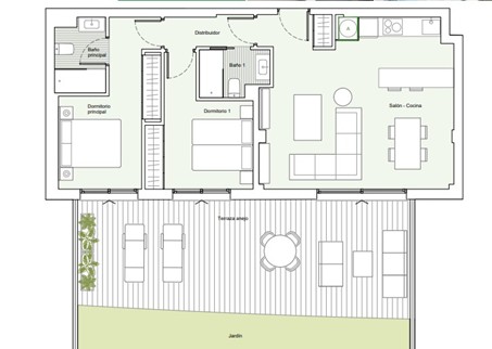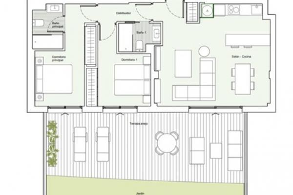 Las imágenes son orientativas, por lo que son susceptibles de modificaciones por motivos técnicos, legales o de otra índole. El mobiliario reflejado es meramente decorativo y no constituye documento contractual. El equipamiento de las viviendas será el que figura en el correspondiente pliego de condiciones.